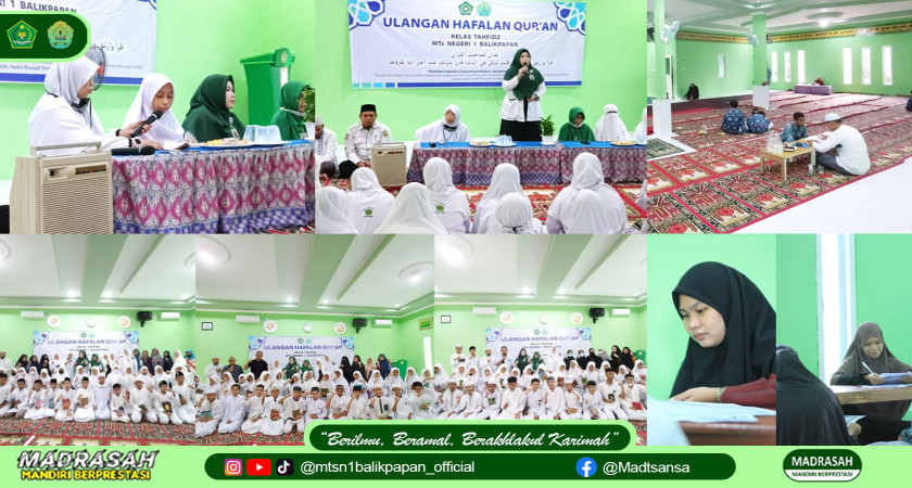Balikpapan_ (madrasah), Ulangan Hafalan Quran kelas Tahfidz di Mts Negeri 1 Balikpapan dilaksanakan menjelang pelaksanaan PAS ganjil tahun Pelajaran 2022-2023. Kegiatan Ulangan Hafalan tersebut diadakan sebagai bentuk evaluasi atau tes yang mengukur pencapaian hasil kompetensi hafalan Quran setiap siswa yang diajarkan oleh ustadz dan ustadzah pengajar tahfidz selama satu semester